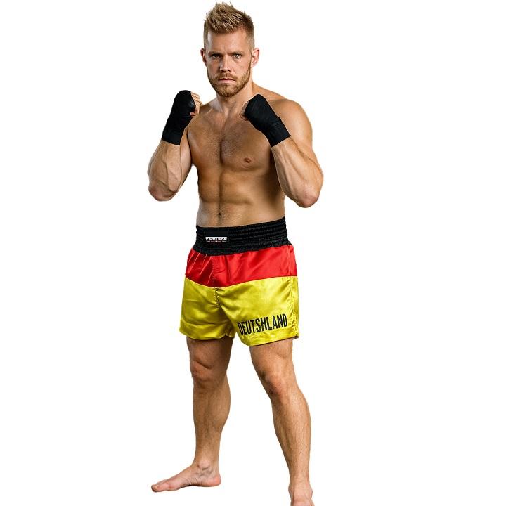 Kick-/Thaiboxing Shorts aus qualitativ hochwertigem edlem Satin. Hervorragende Verarbeitung (hand made). Schwarz - Rot - Gelb gestreifte Hose mit Schriftzug DEUTSCHLAND auf dem linken Bein.Mit breitem elastischen Bund und seitlichen Schlitzen für perfekten Tragekomfort. Schnürung in der Innenseite. Spezieller Schnitt für High-Kicks und Kniestösse.